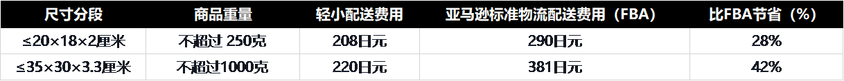 注:2023年4月1日起,日本站点,“亚马逊物流轻小商品计划”的每件商品配送费用将提高 15 日元,以上费用对比均依照2023 年 4 月 1 日后生效的费率进行计算,后续如有变更,以“亚马逊卖家平台”最新通知为准。
