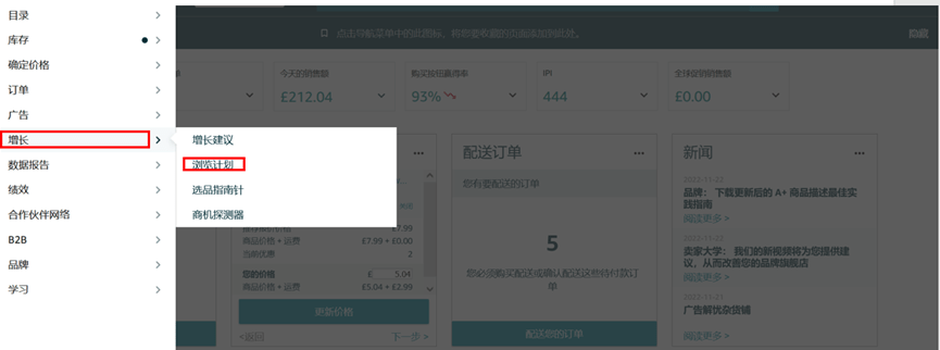 • 方法1:卖家可在卖家后台左侧菜单中点击【增长】下的【浏览计划】;
