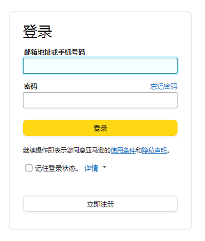 打开浏览器,输入下面对应的卖家登录网址,进入网站后输入注册亚马逊卖家账号时使用的邮箱地址或手机号码,输入密码后点击登录。