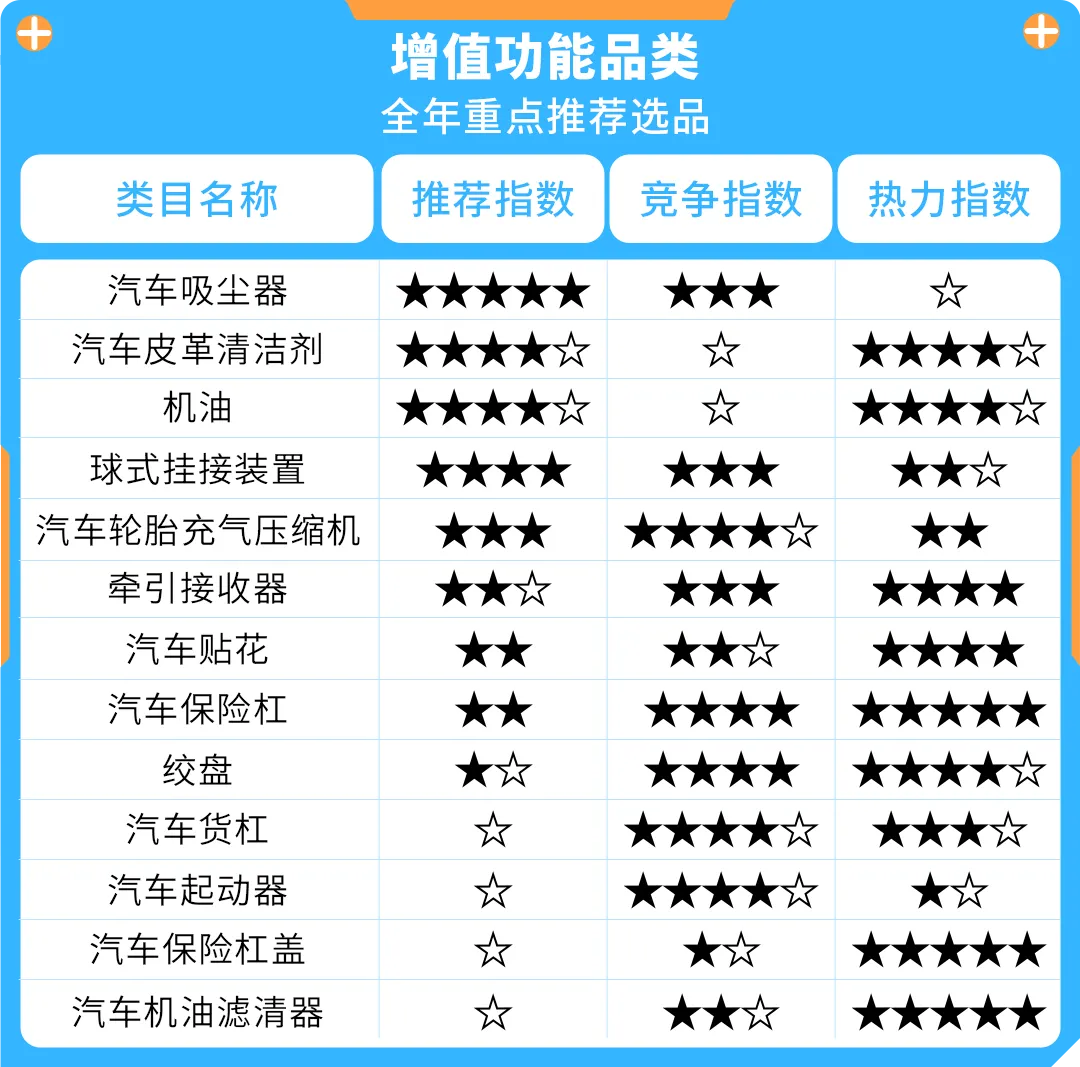 汽配细分品类众多。从汽车车系看,全球不同品牌的车对应不同的汽车配件和零部件;从应用场景看,可以分为汽车、摩托车等;从功能上看,又可以分为基础功能类、增值功能类、个性化需求类等等,体现了市场的多样化需求。汽配重点产品推荐表如下: