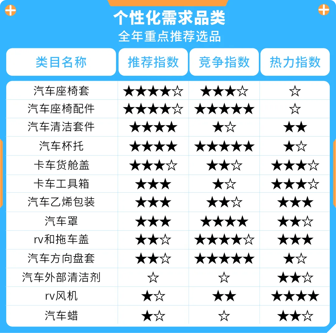 注:推荐指数考虑了多个参数,包括类目在站点容量、增长速度、中国卖家渗透率、渗透速度等,星级越高越推荐;竞争指数考虑了中国卖家的渗透率情况,星级越高竞争程度越低,越推荐进入;热力指数考虑了过去特定时间段的销售增长幅度,星级越高增速越快。