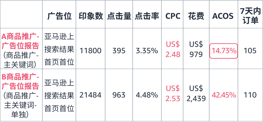 如上图,通过查看广告位报告,可发现同一款产品的不同关键词(分别设置为商品推广A组和B组),在首页广告位中的ACOS相差28%,由此可推测相对B组,A组的关键词更适合被投放至首页广告位中。