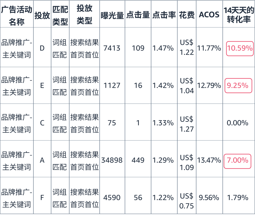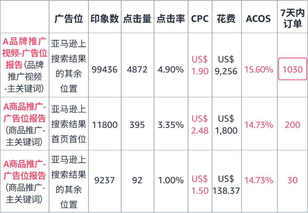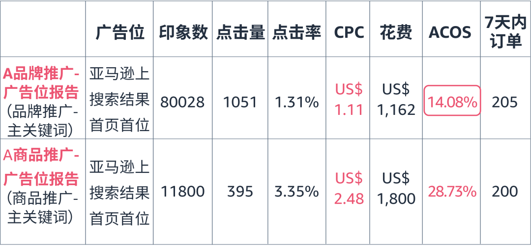如上图,我们为上述的商品推广A组的关键词创建了新的品牌推广(A组),通过对比两个广告位报告可得,在14天总订单数相近的情况下,该关键词对应的品牌广告获取首页广告位中的ACOS仅为14%,而对应的商品推广广告则需要28%。因此,该款产品更适合通过品牌广告进行首页广告位推广。