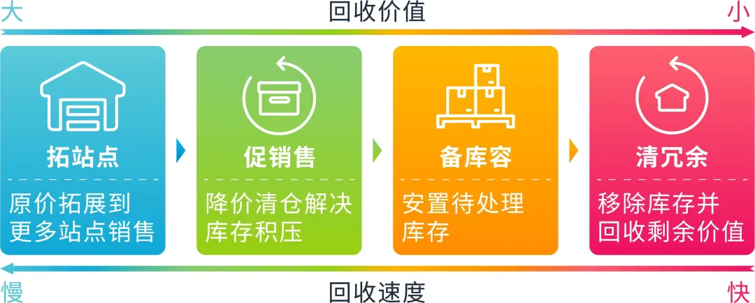 针对冗余库存,建议要及时处理,避免产生大额的仓储费用支出。卖家可根据回收价值高低、自身回收速度需求,尝试“四步走”组合拳:拓站点➜促销售➜备库容➜清冗余。