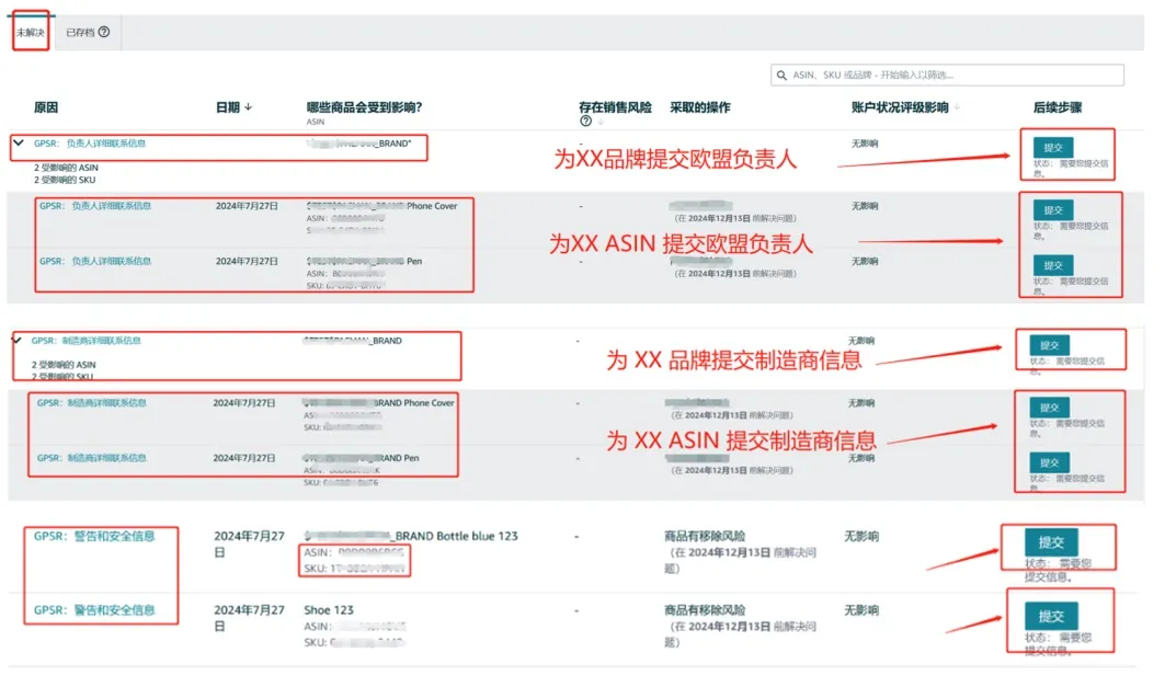请注意:您如果有继续销售同一品牌的商品,那么您仍将在“未解决”子页面中看到该品牌(可以不需要给这些ASIN上传GPSR要求的信息)。