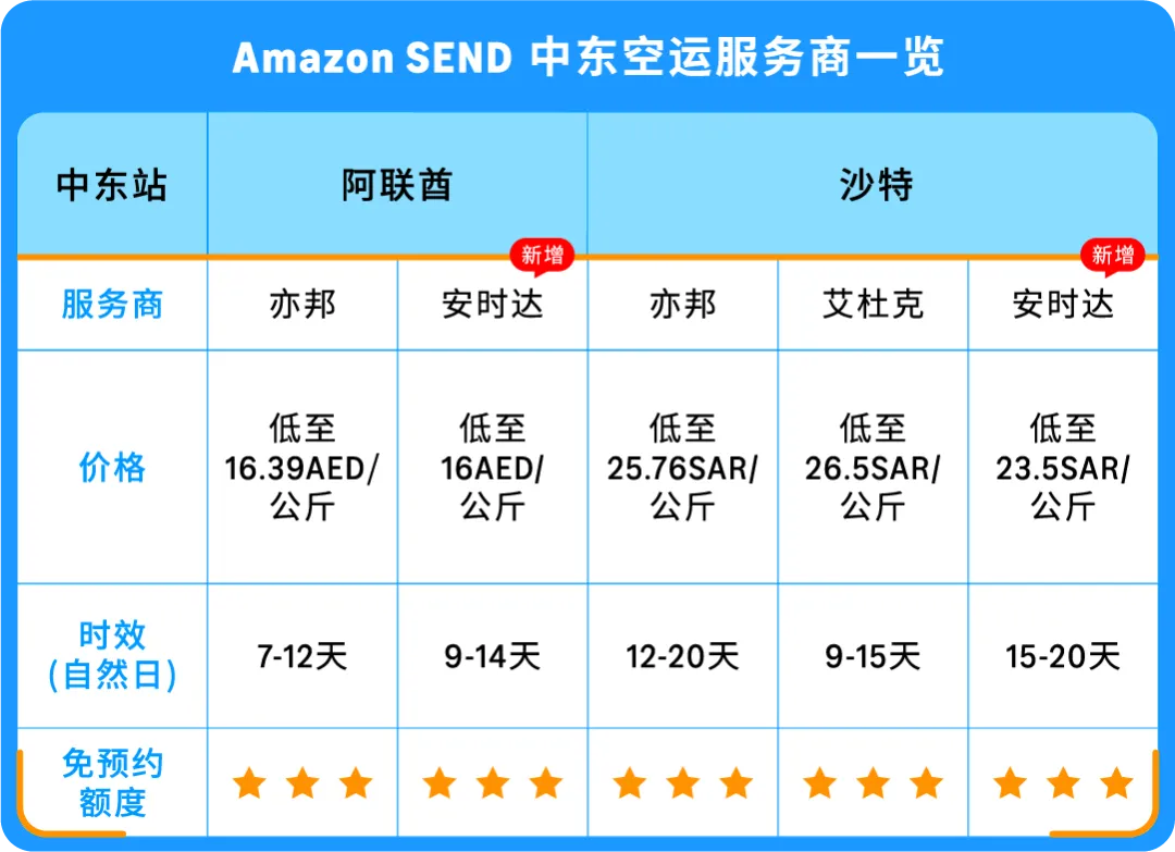🔥 紧急补货:Amazon SEND空运派送中东站平均7~14天即可送达,可帮助卖家在大促等特殊情况下紧急补货。