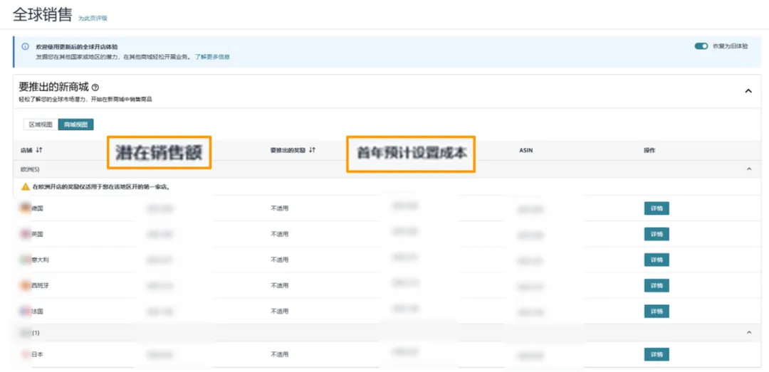 卖家在主站点大卖后如何即时把握商机?全球销售为您排忧解难!将基于目标站点中的分类趋势和您的目录的预测需求,提前评估您在目标站点的销售潜力。同时,还将为您显示在新站点开店时可能产生的不同成本,帮助您找到有机会的潜力站点,快速拓展业务。