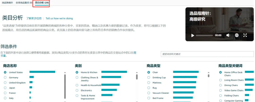 ② 卖家平台“库存”菜单 > 全球销售 > 商城商品指南 > 选品指南针 > 类目分析