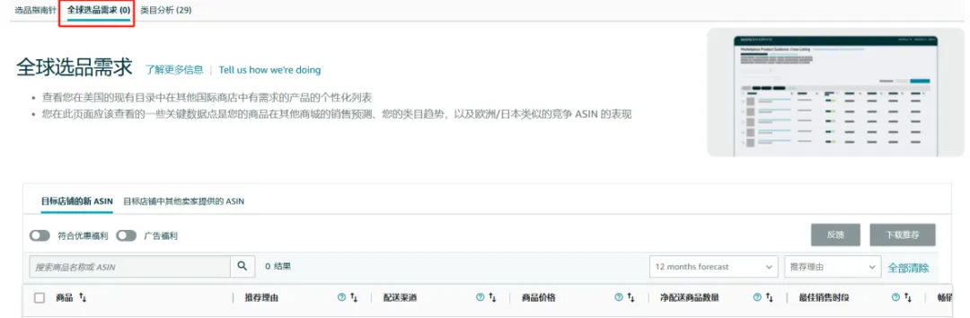 首先您需要选择一个目标站点,然后系统会给您推荐值得在该选中的目标站点进行销售的ASIN,并且会给出未来12个月的销量预测。