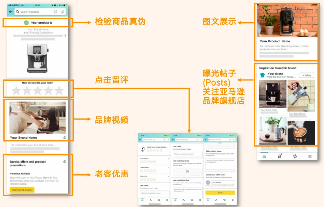 卡片背面可以引导买家用亚马逊购物App扫描商品上的Transparency条码。扫码后,买家不仅可以检验商品真伪,还可以跳转到品牌自建的扫码落地页,为商品一键留评。同时还能浏览品牌故事、商品视频、促销信息、Posts(帖子)等,并关注亚马逊品牌旗舰店,成为品牌“铁粉”,增加复购与连带销售的机会!
