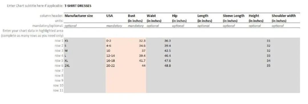 首先,我们先来看下产品详情页上展示给顾客的尺码表及卖家在SIT上传时需要填写的尺码表模板。