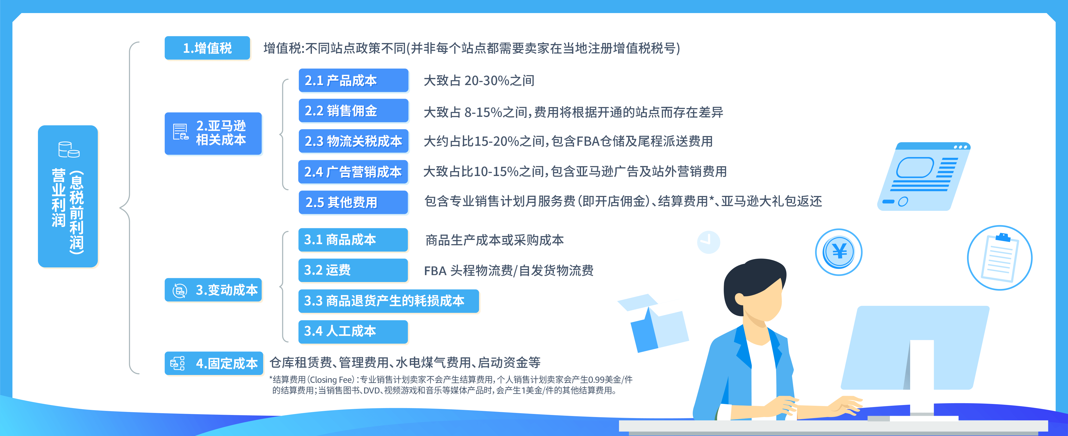 在亚马逊上开店,您需要考虑到专业销售计划月服务费、销售佣金、物流费用以及推广费用、退款手续费、清单费、付费账户服务等额外成本。具体的费用请查看开店成本。