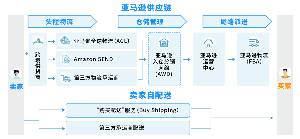 卖家销售,亚马逊配送。您仅需将产品批量发送至亚马逊运营中心,后续物流步骤均由亚马逊为您完成并提供售后服务,帮助您节省人力、物力和财力。若您使用FBA服务,您还可以触及海量Prime会员、享受次日达/隔日达配送服务、赢得“购买按钮”、并得到全天候专业客服。