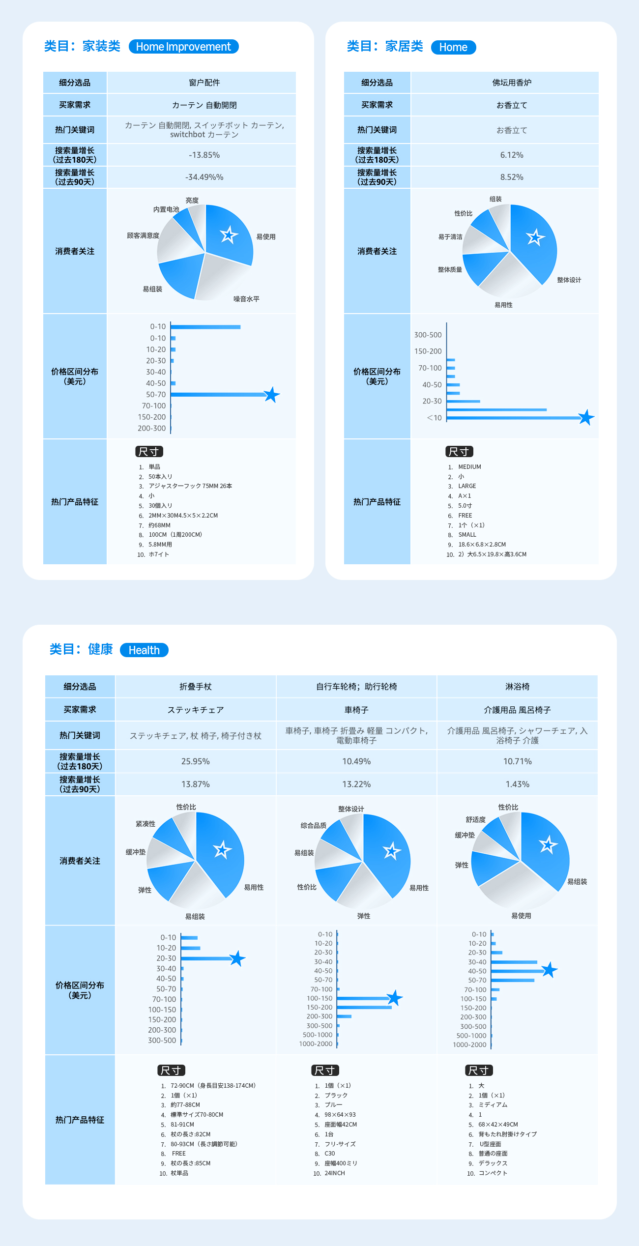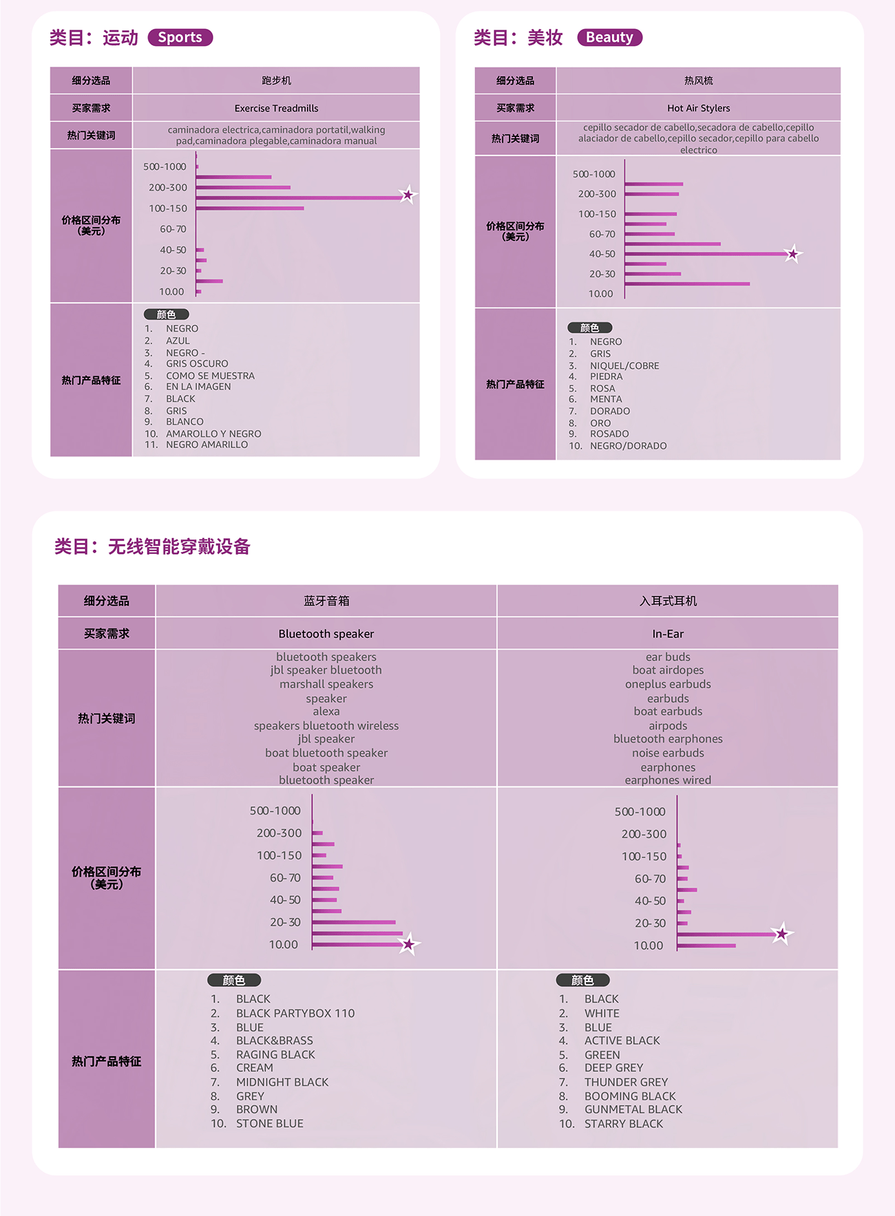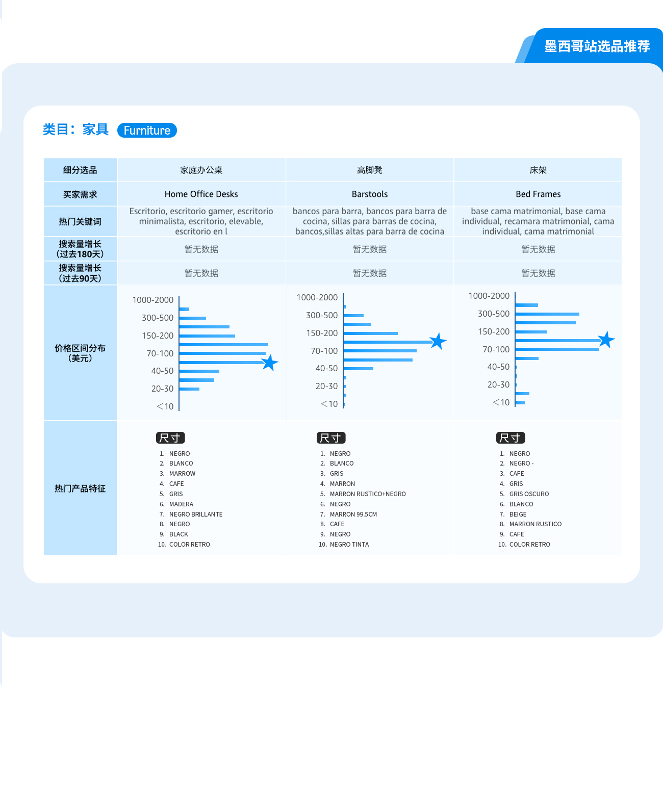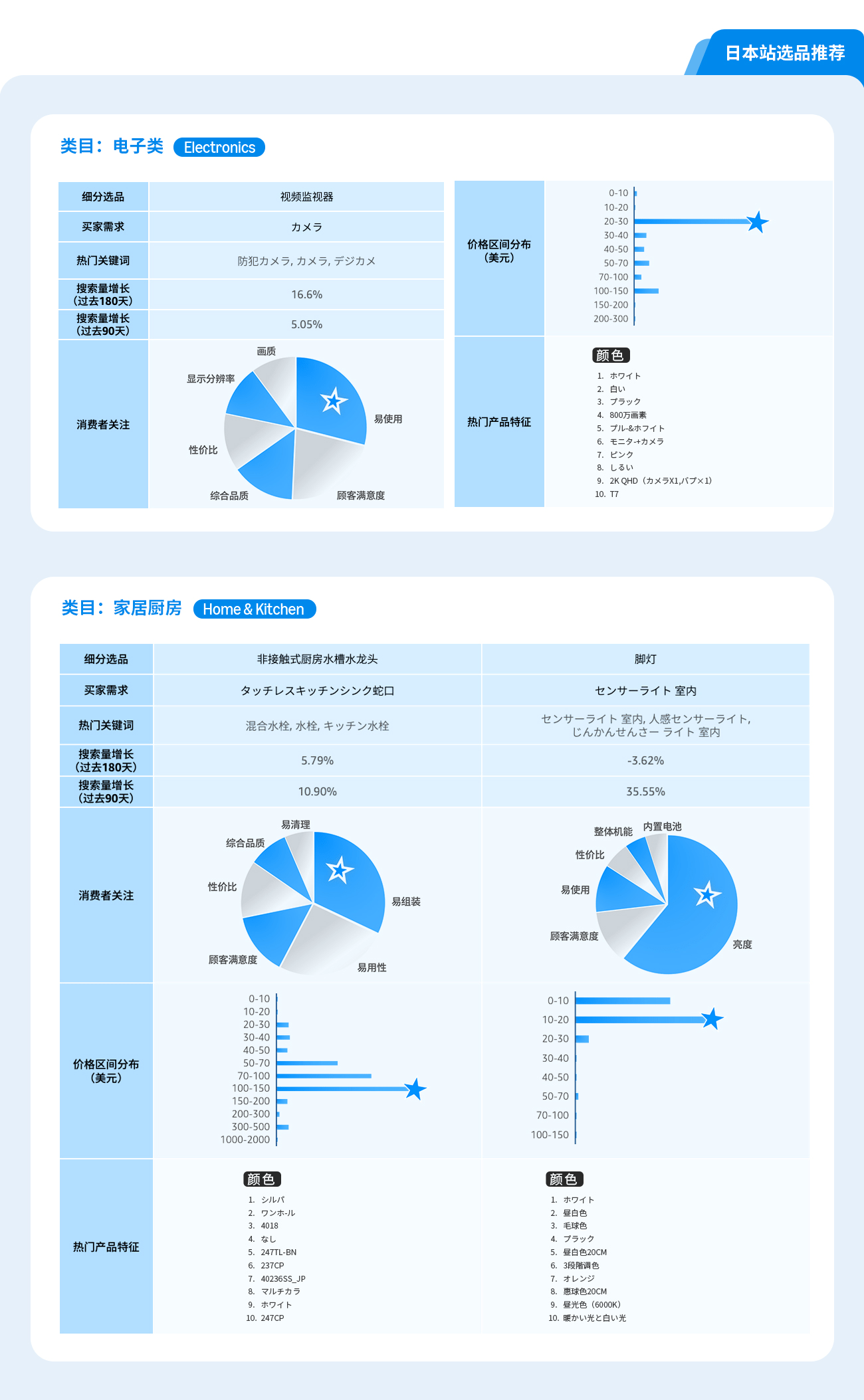 通过选品指南针中“类目分析”解决方案的产品特征趋势, 可以了解到目标市场的产品价格区间, 买家对于产品功能, 颜色, 特性, 型号等偏好, 绿色值越长, 代表该特性的需求越高。