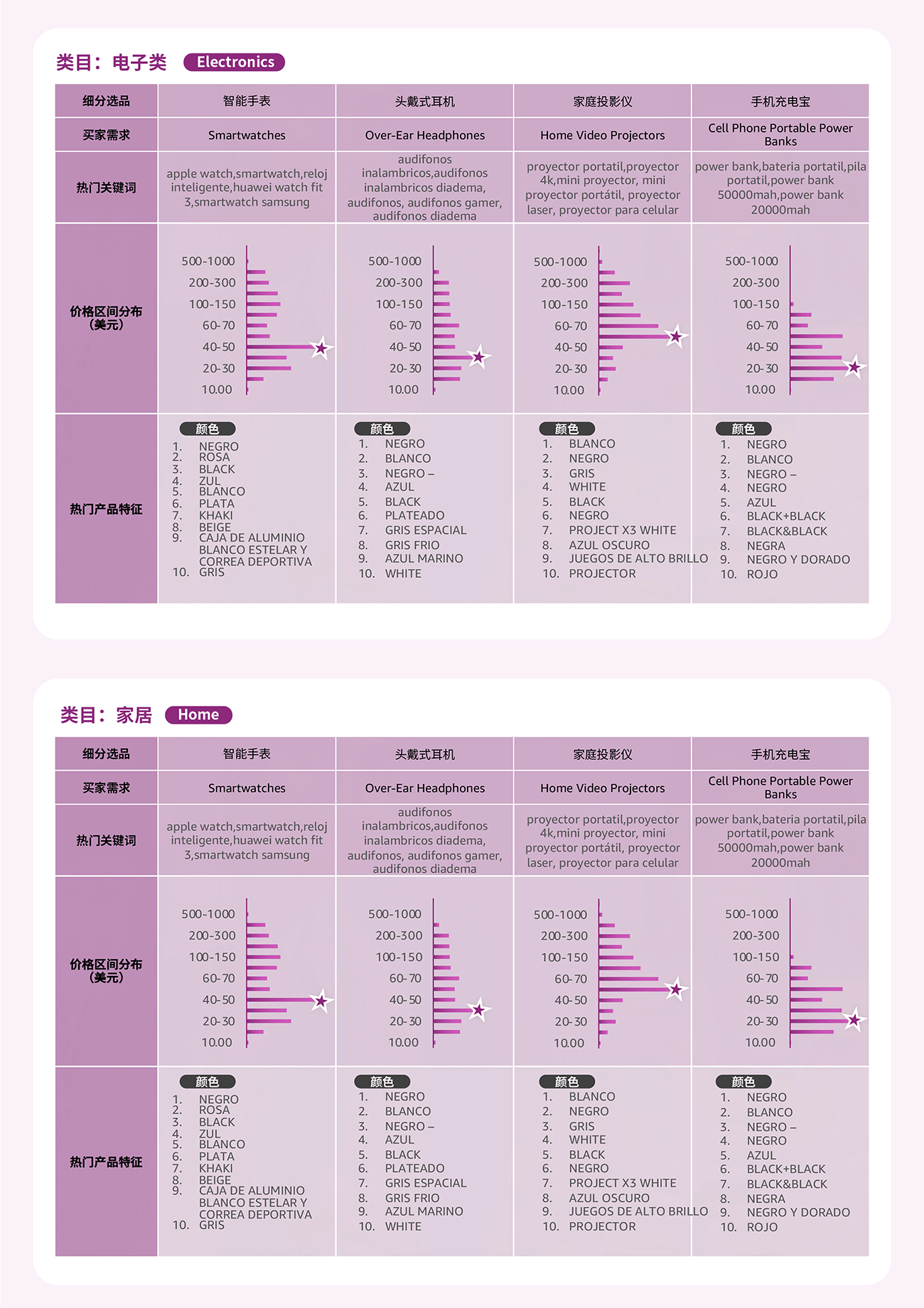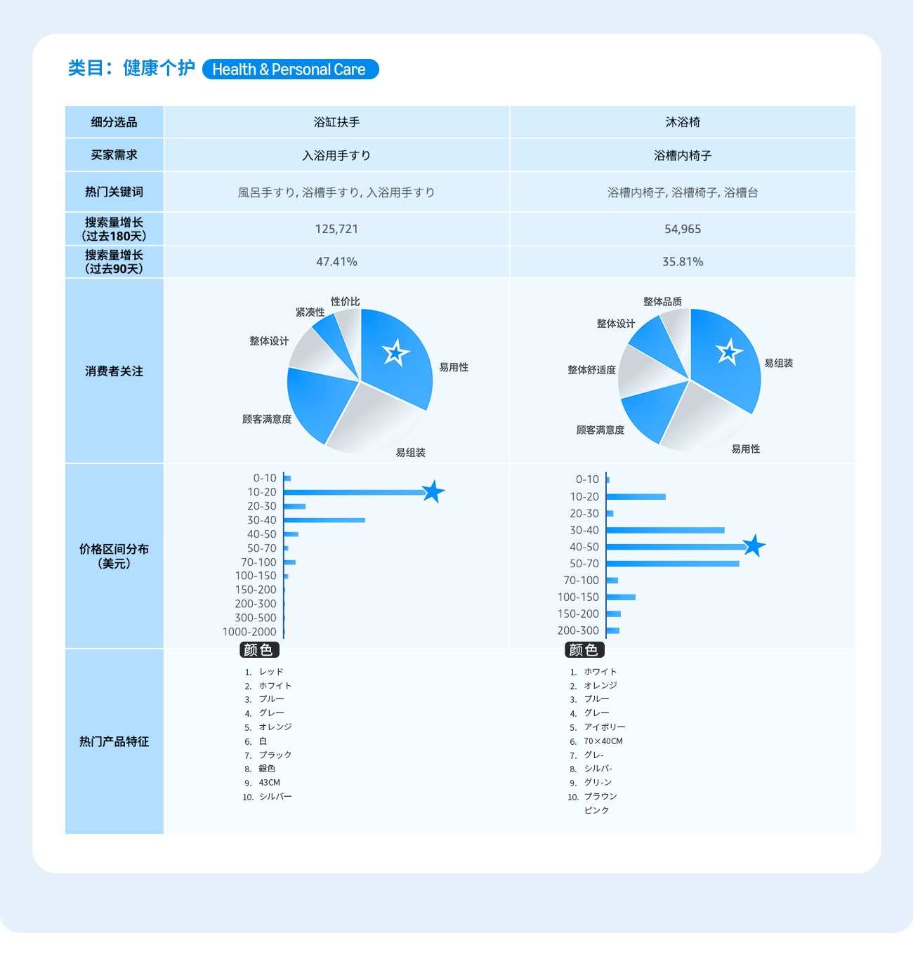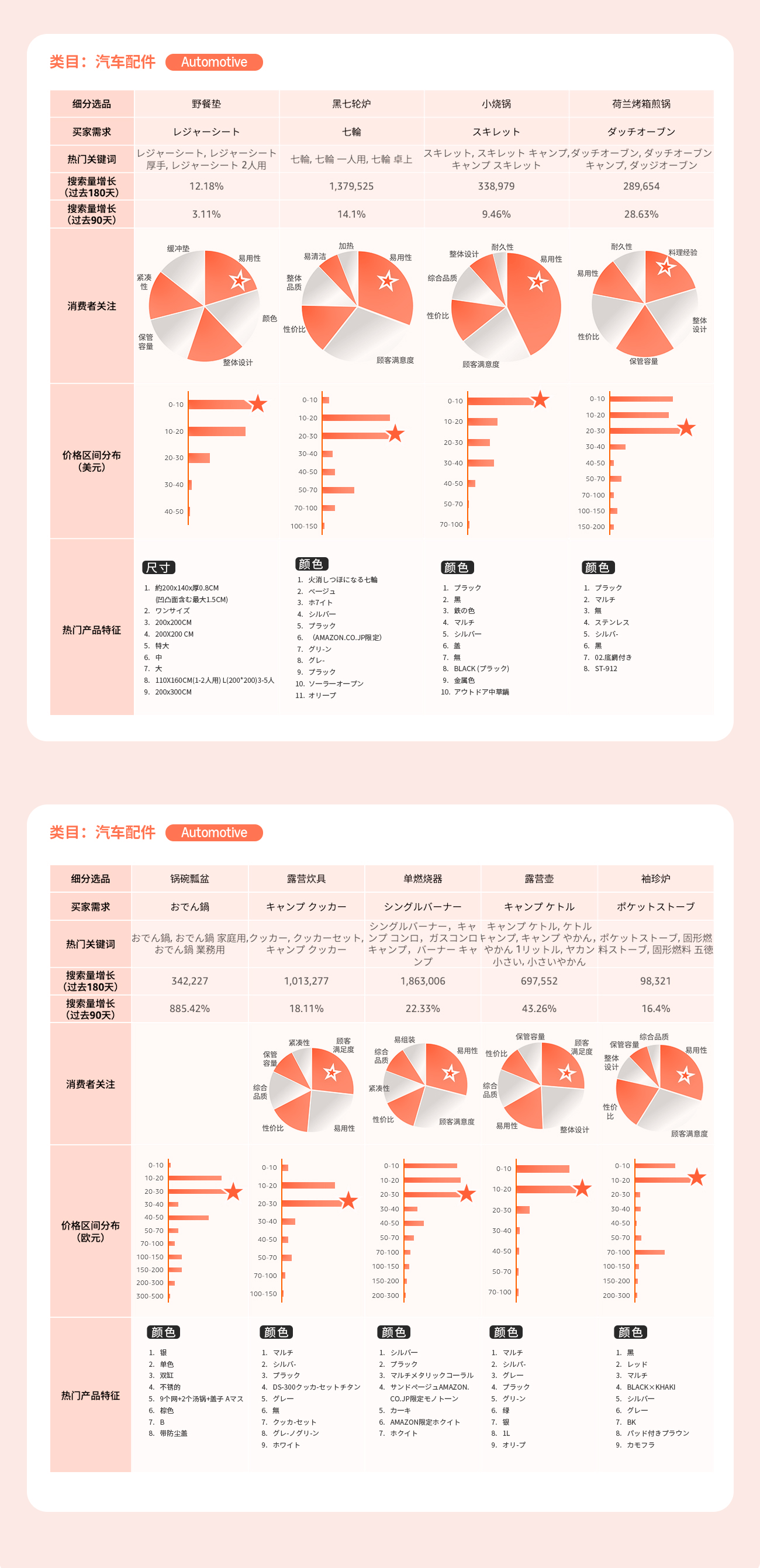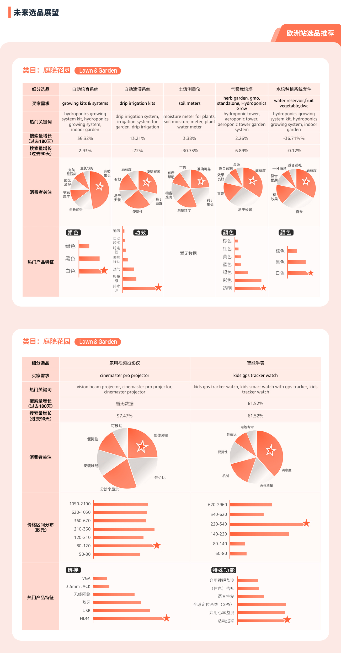 通过选品指南针中“类目分析”解决方案的产品特征趋势, 可以了解到目标市场的产品价格区间, 买家对于产品功能, 颜色, 特性, 型号等偏好, 绿色值越长, 代表该特性的需求越高。