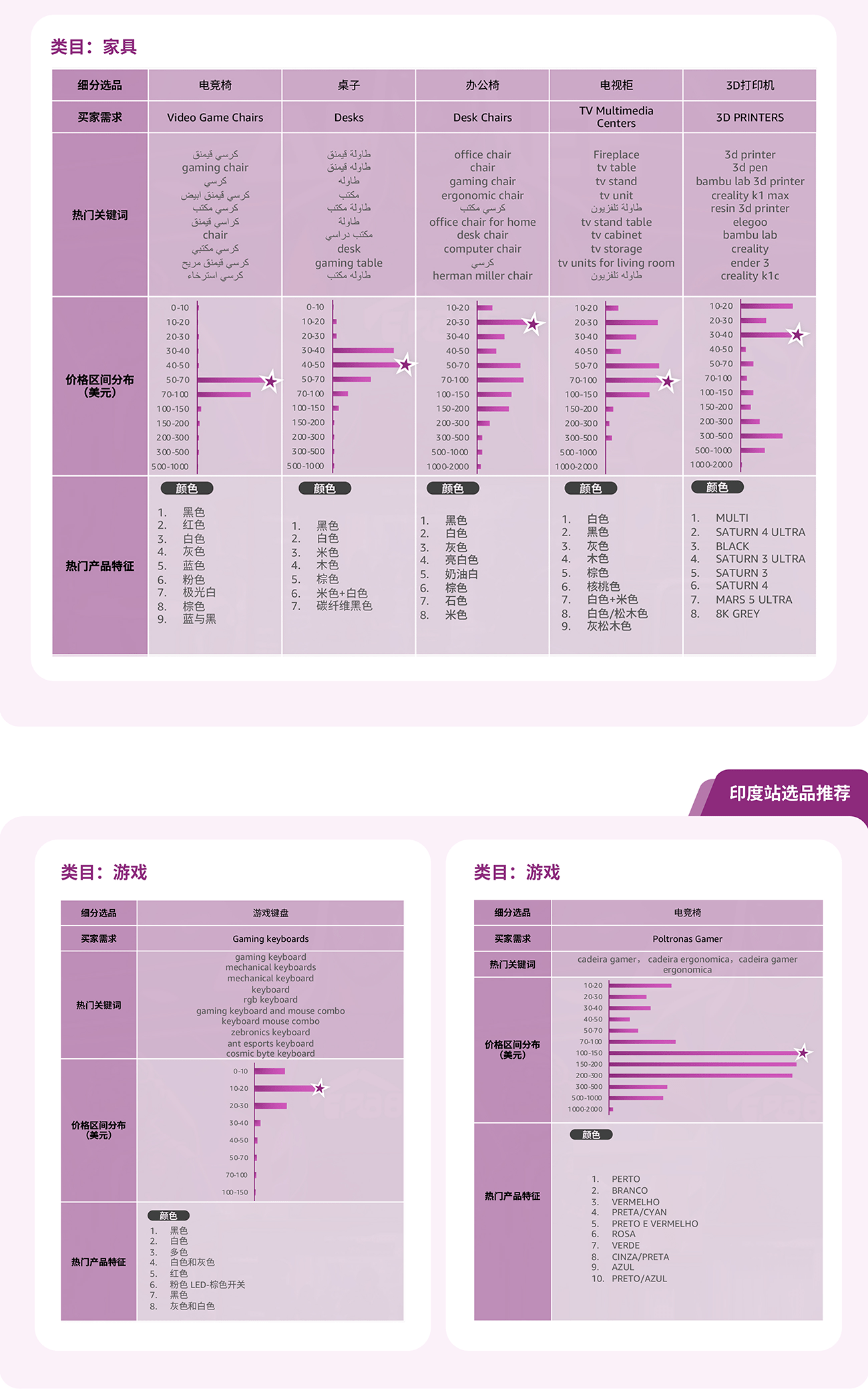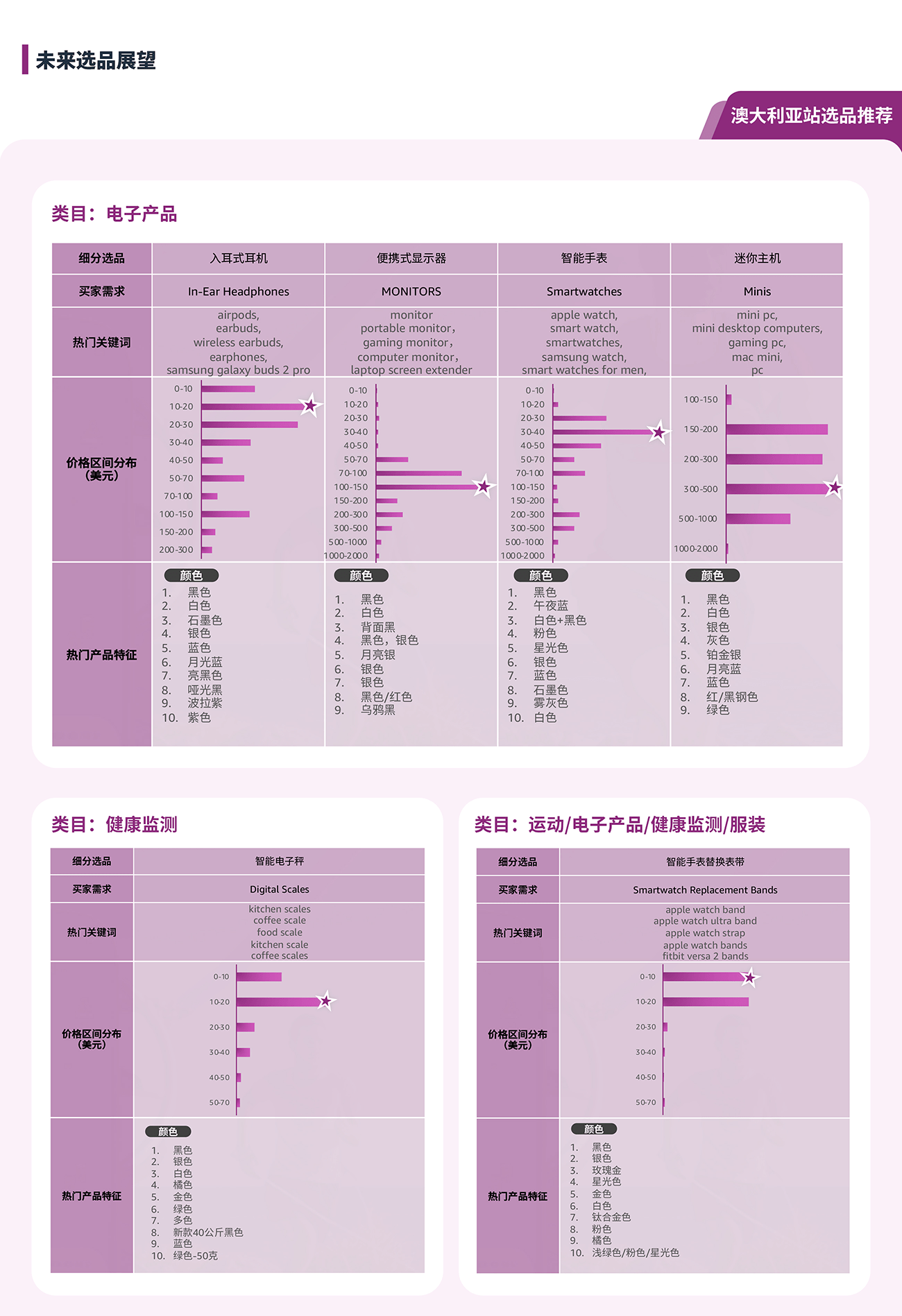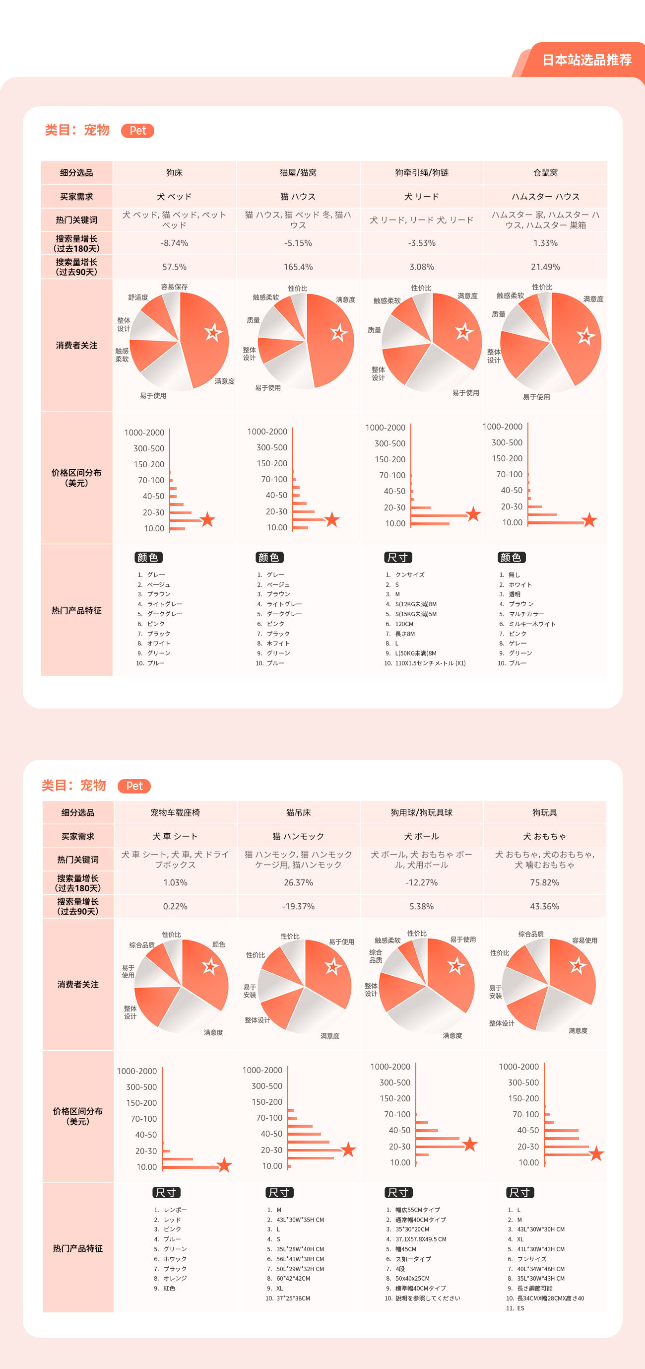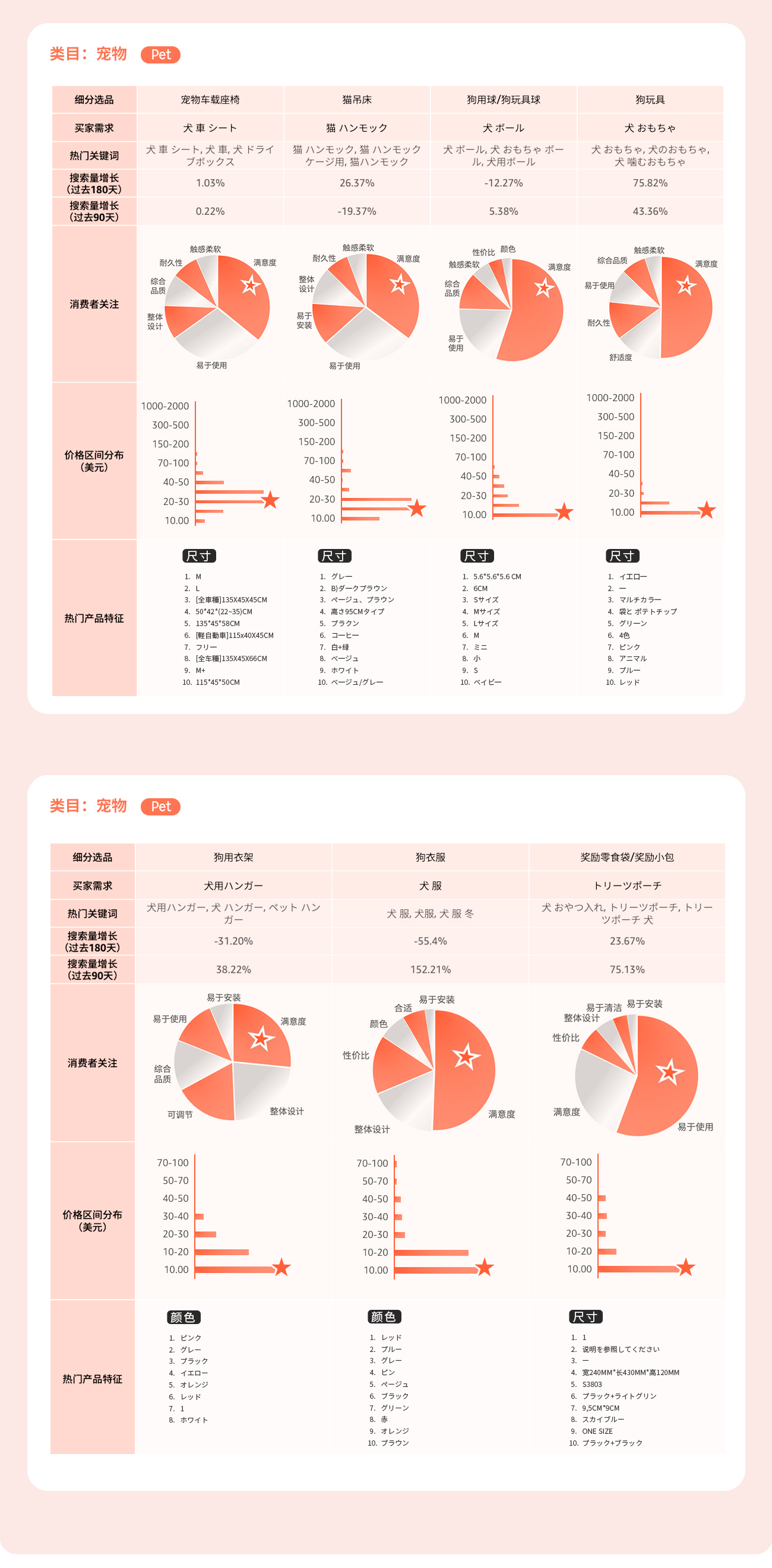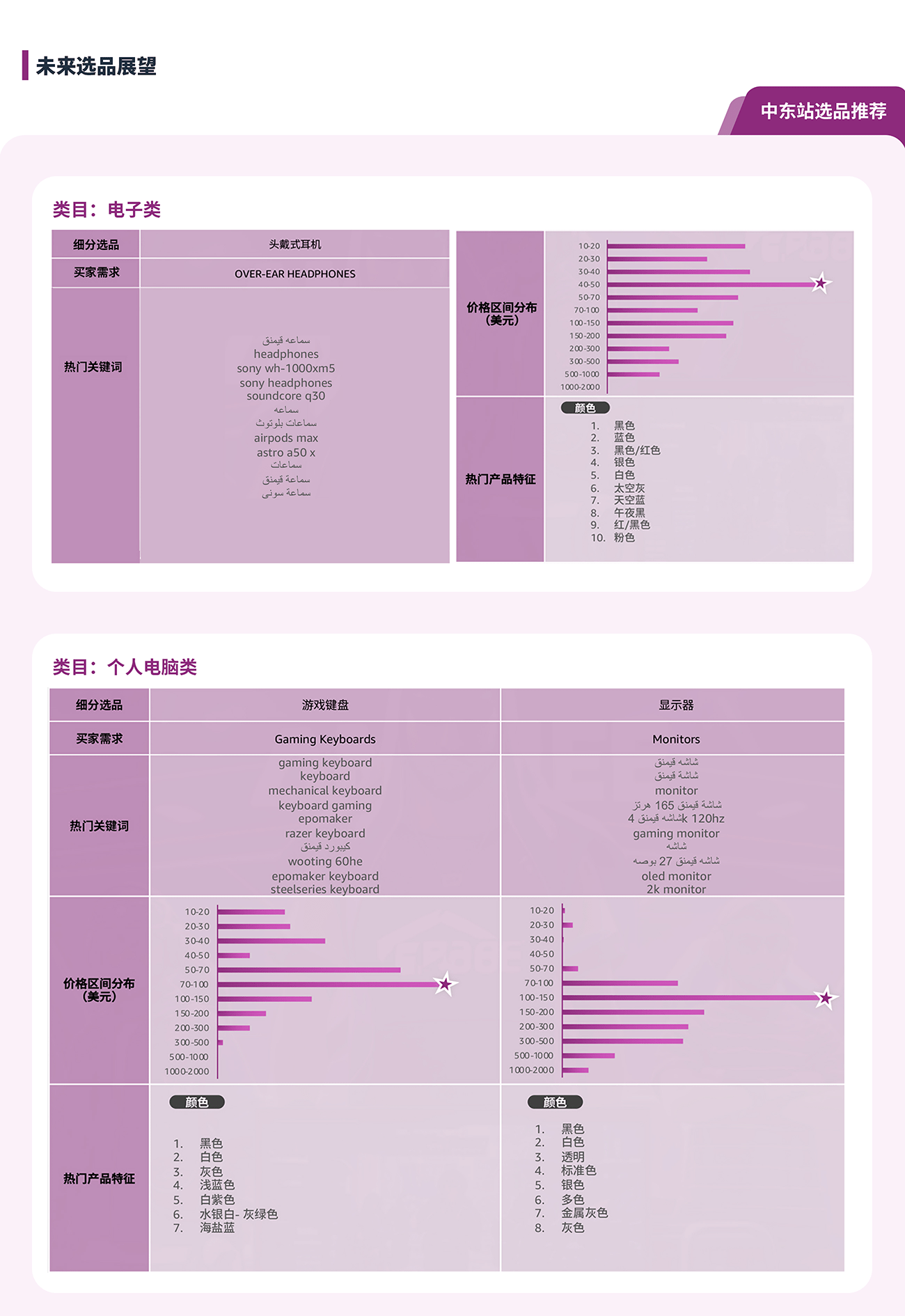 通过选品指南针中“类目分析”解决方案的产品特征趋势, 可以了解到目标市场的产品价格区间, 买家对于产品功能, 颜色, 特性, 型号等偏好, 绿色值越长, 代表该特性的需求越高。