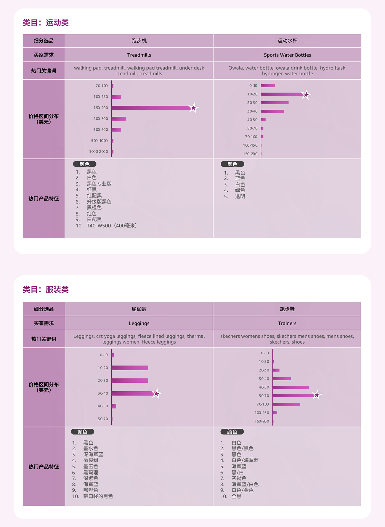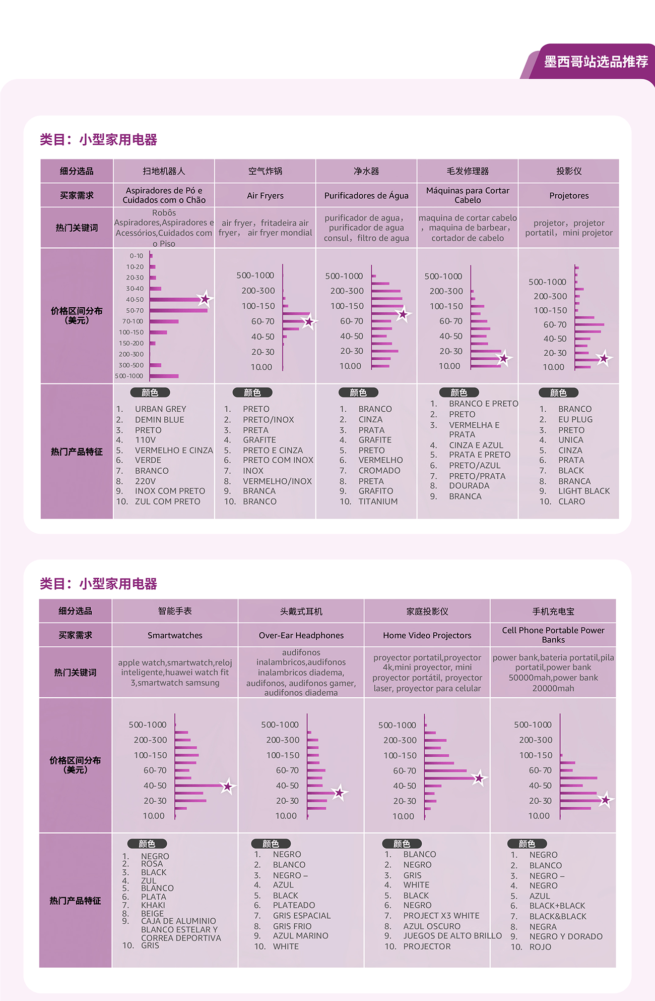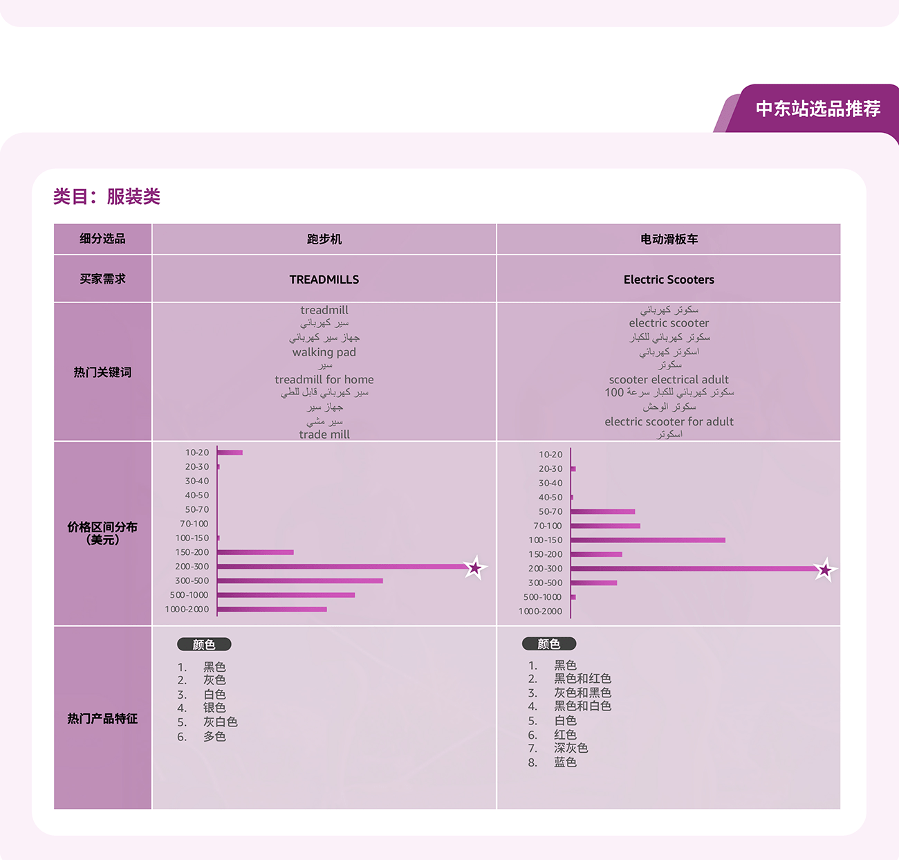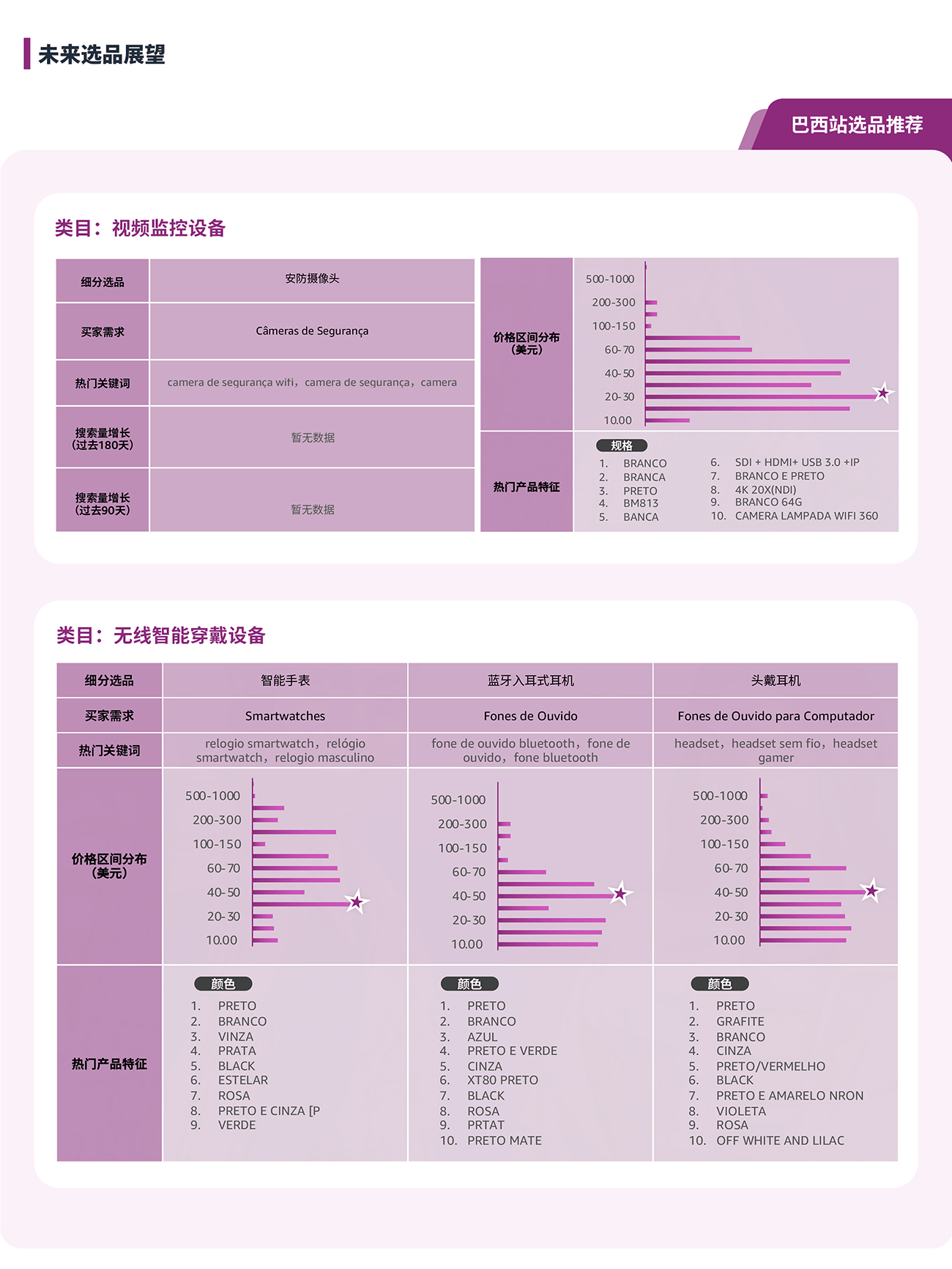 通过选品指南针中“类目分析”解决方案的产品特征趋势, 可以了解到目标市场的产品价格区间, 买家对于产品功能, 颜色, 特性, 型号等偏好, 绿色值越长, 代表该特性的需求越高。