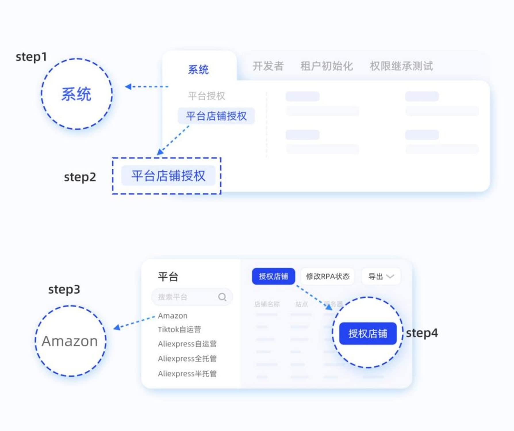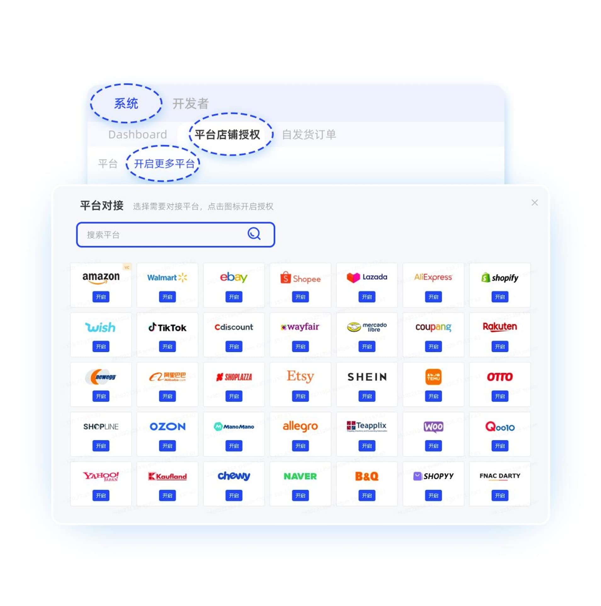 3. 完成非亚马逊平台的店铺授权,在【系统-平台店铺授权-开启更多平台】,选择需要的平台,点击平台图标,根据弹出的内容填写进行授权。若有疑问,可以点击如下文档查看: