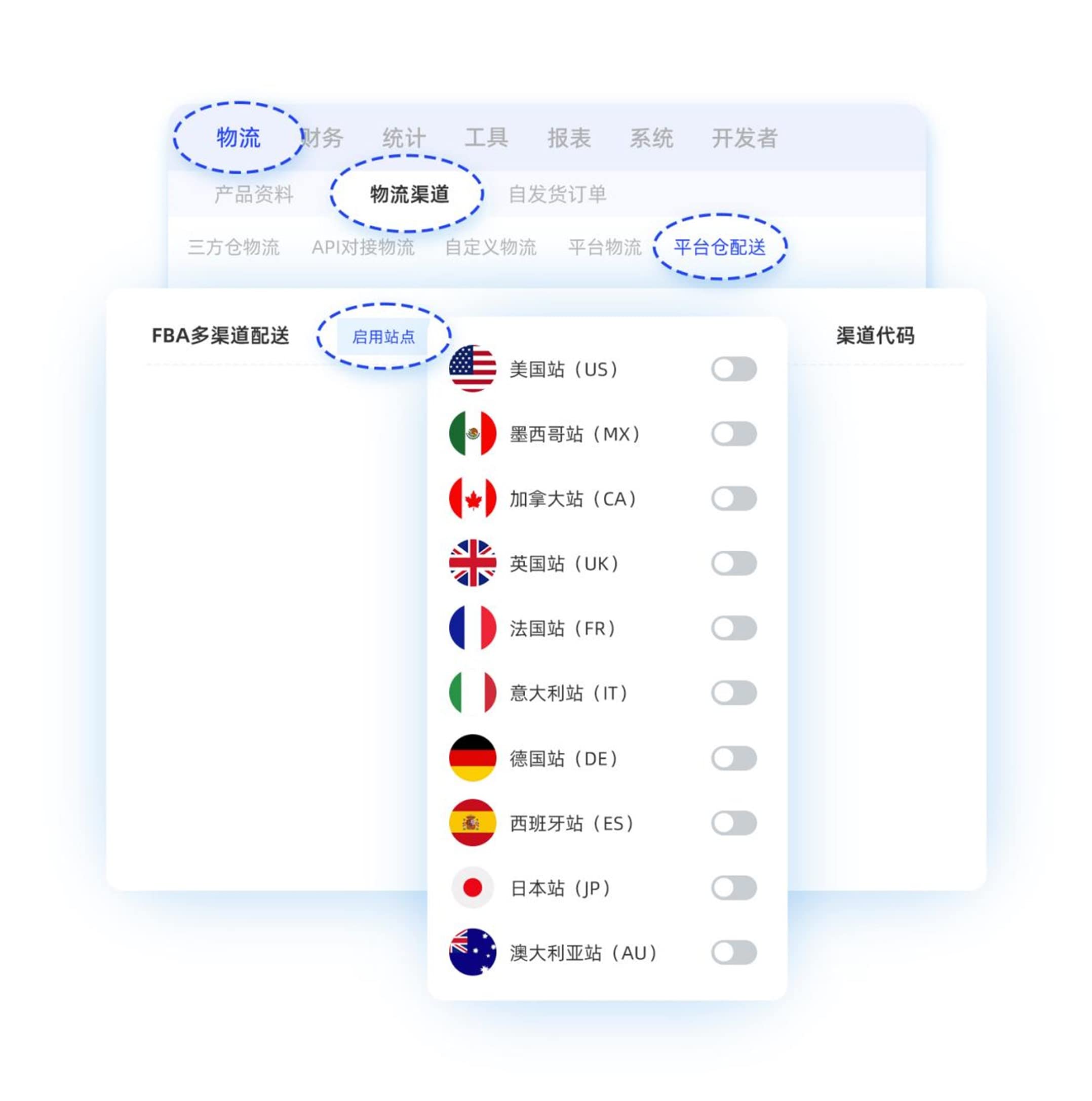b. 在【物流-物流渠道-平台仓配送】开启需要使用亚马逊MCF服务的平台、站点以及完成销售渠道的承运商与亚马逊承运商的映射关系