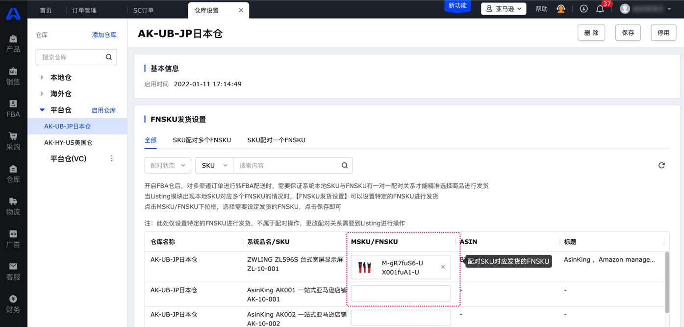 步骤一:将SKU与对应发货FNSKU进行配对
