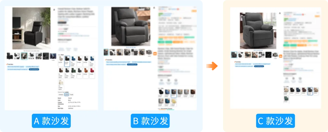 在筹备阶段,他先对亚马逊类目BS前十的产品进行深度分析,从功能、结构、面料以及利润空间等维度数据,筛选出A、B款两款表现突出的沙发,随后,他结合两款产品的优势,设计出兼具美观与功能性的C款沙发。
