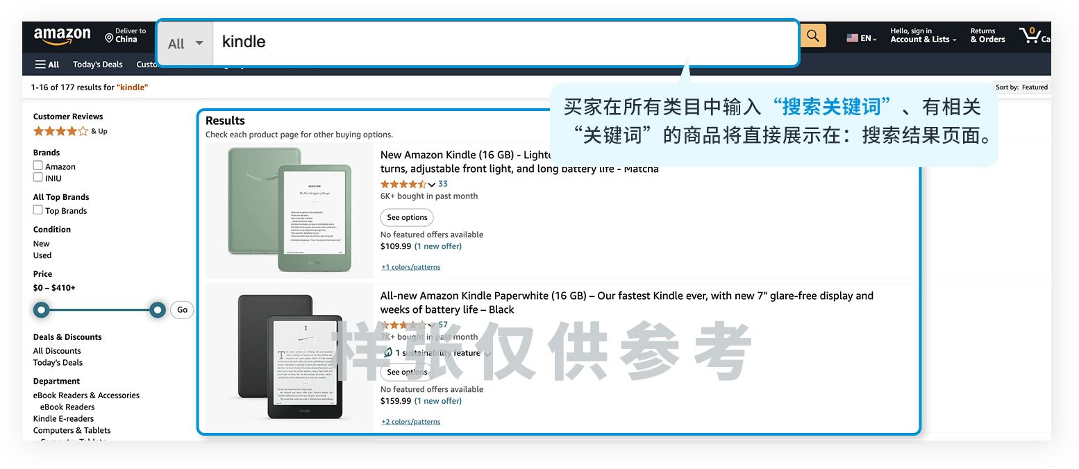情景设定:美国买家 A 打算在亚马逊购买 Kindle,他在亚马逊美国站搜索关键词的历程分以下几步。