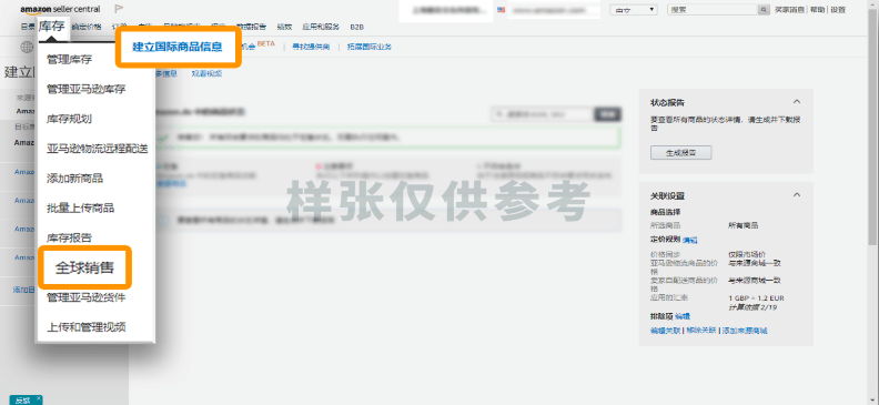 1/从“库存”下拉菜单中,选择“全球销售”,点击“建立国际商品信息”,然后点击“开始使用”。