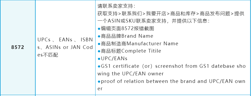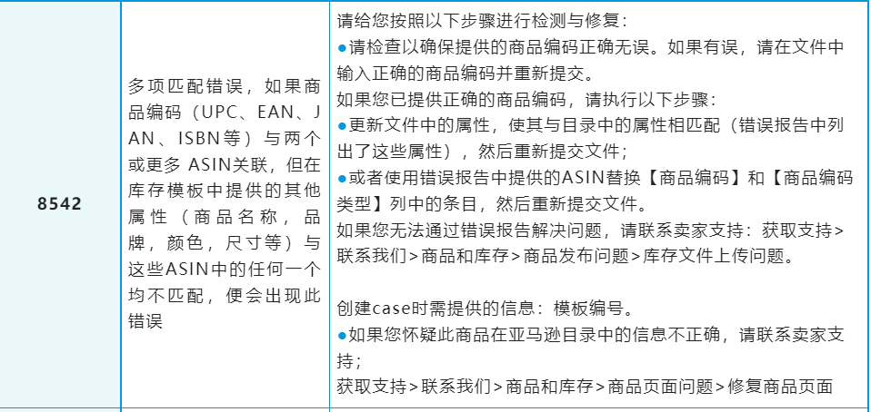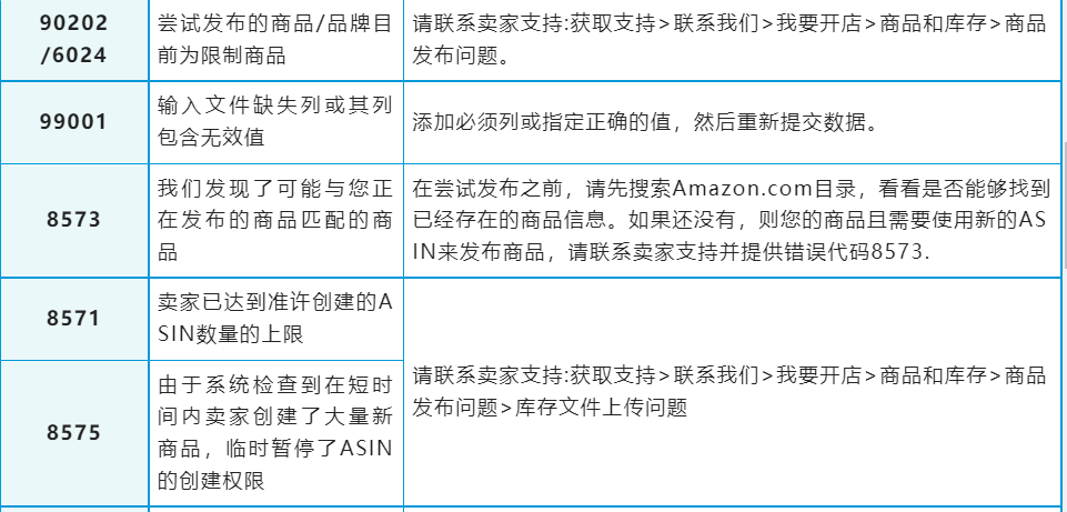 如果你遇到的问题暂未在表格中找到解决方案,你可登入亚马逊卖家平台,并在搜索框内输入“错误代码说明”查看更多处理办法。