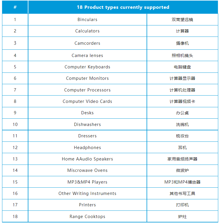 目前支持的产品类别 (Product Type):