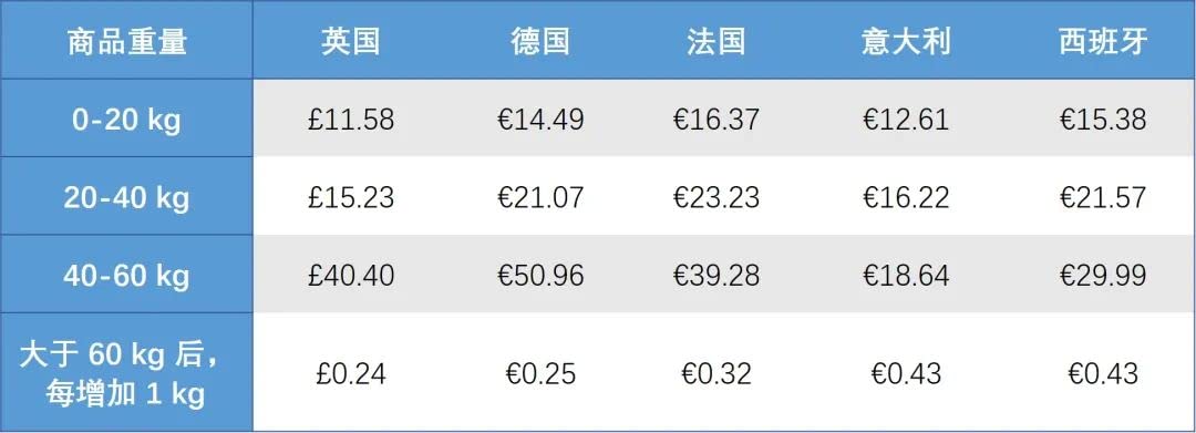 亚马逊物流重型大件商品计划费用与标准亚马逊物流一样,按使用付费。您可以参考以下表格,查看该计划的配送费用: