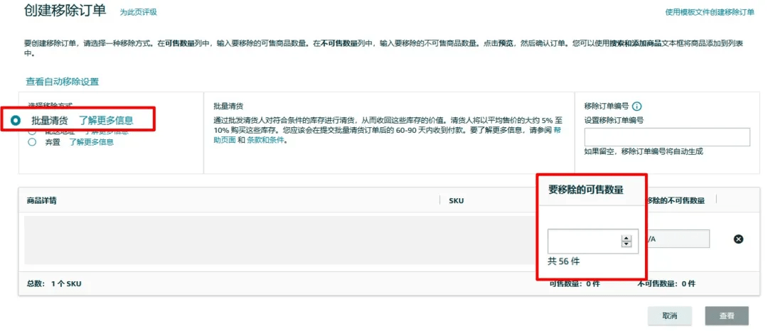 在“创建移除订单”页面中的“选择移除方式”模块下,选择“批量清货”,并填写要清货的商品数量(【可售数量】或【不可售数量】),然后点击“查看”,进入到订单检查页面。