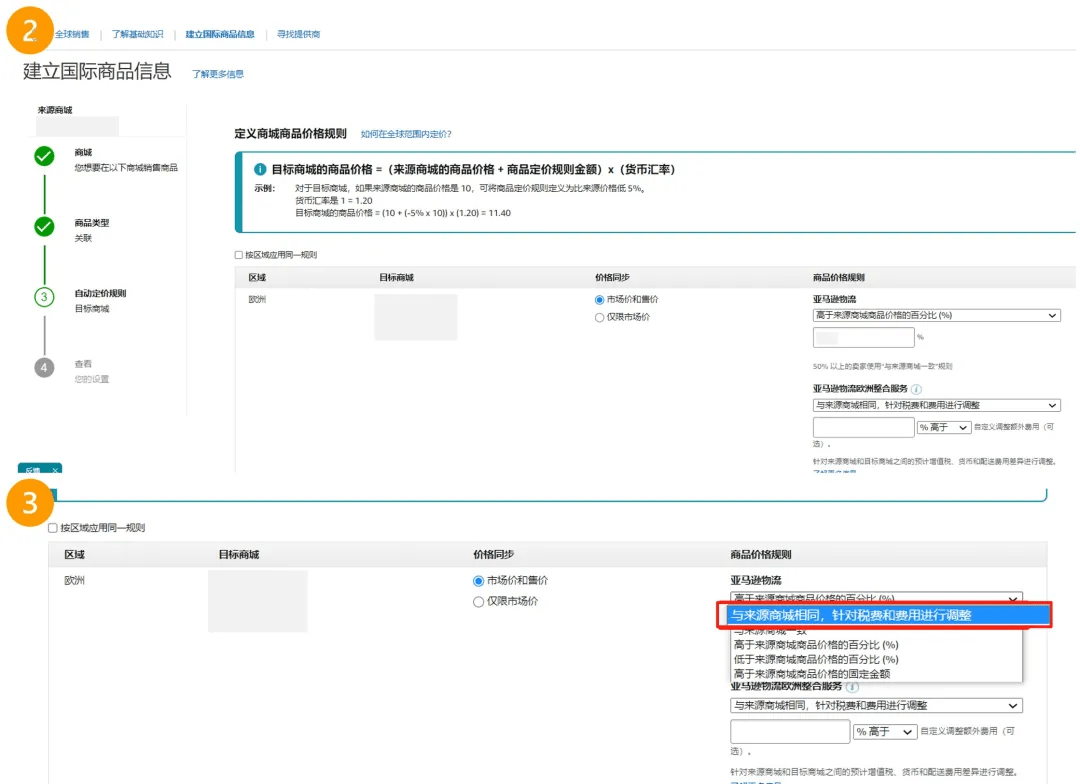 ▲使用“建立国际商品信息”工具(BIL),并采用“与来源站点相同,根据税费和费用进行调整”的特殊自动定价规则。此规则会将来源店铺的价格与目标店铺的价格同步,以体现配送费用、税率和汇率,以及您对来源店铺价格所做的任何更改。