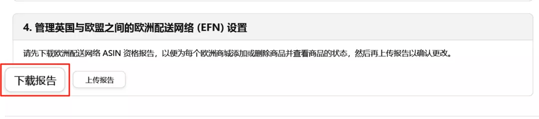 在您的ASIN成功启用欧洲配送网络(EFN)后,您可以使用【亚马逊物流欧洲整合服务库存】页面上的ASIN资格报告(【报告】选项卡>【管理您在英国与欧盟的欧洲配送网络设置】>【下载报告】),来检查商品状态并管理注册情况。
