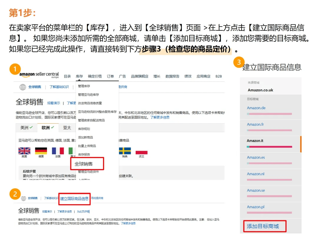 步骤二:在英国店铺以及以下任一或所有欧盟店铺中发布商品信息:德国、法国、意大利和西班牙