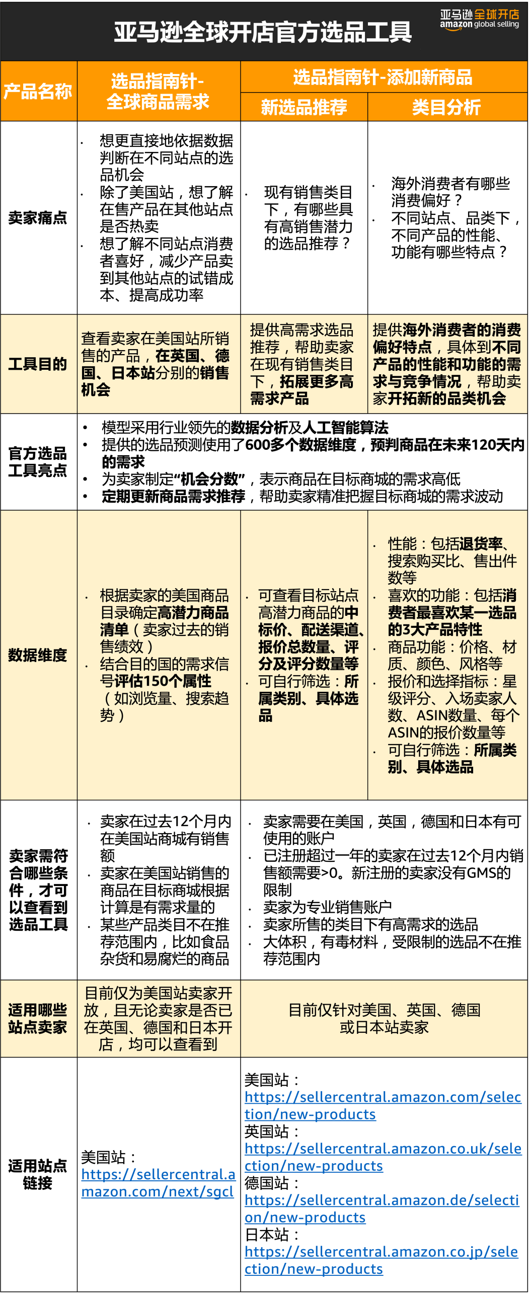选品指南针工具是亚马逊官方为卖家定制的解决方案,帮助卖家探索、评估并且抓住全球扩张的最有利机会。基于卖家在主站点已有的产品类目,这套方案通过计算“机会分数”有针对性地为卖家推荐适合拓展的站点和国家,并为卖家分析本站和跨国其他站点的高需求商品,客户的喜好以及不同类目下选品的比较。