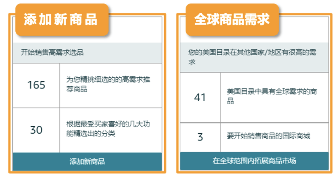 收到推荐的卖家以主账号登录卖家平台主页,美国站卖家能看到名为【全球商品需求】、【添加新商品】的选项卡;英国站、德国站和日本站的卖家能看到名为【添加新商品】的选项卡。【全球商品需求】选项卡列出了为卖家推荐的跨站点高需求产品数量;【添加新商品】选项卡显示了该站点针对卖家识别到的,高需求商品推荐以及类目信息的数量。卖家可以点击选项卡访问选品推荐详情。