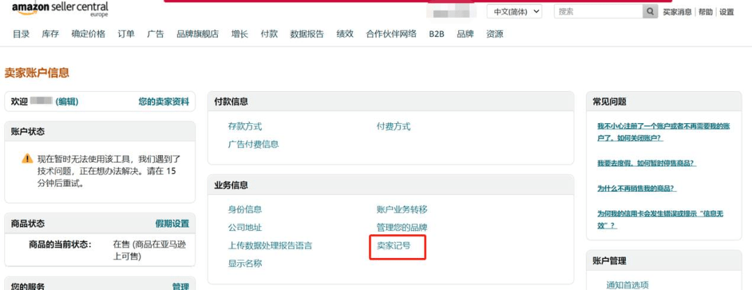 ● 若您已开店,则还需要填写“卖家记号”。“卖家记号”指的是您的主营站点的卖家记号,路径是:您进入亚马逊卖家平台-设置-账户信息-查看您的卖家记号。