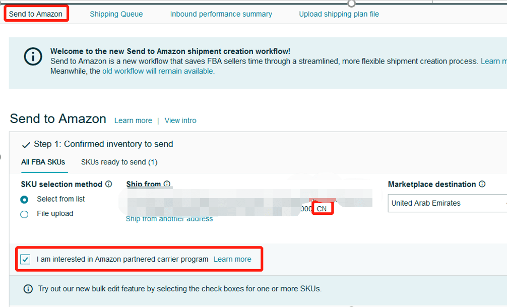 1)您可以在SC后台,通过Inventory下拉菜单中的Manage FBA Shipments,选择亚马逊合作承运人(Send to Amazon),并在第一步: 选择要运送的库存(Step 1: Confirmed inventory to send)中, 往下勾选“我对亚马逊合作承运人计划感兴趣”复选框,即可开始勾选需要发运的 SKUs资料.