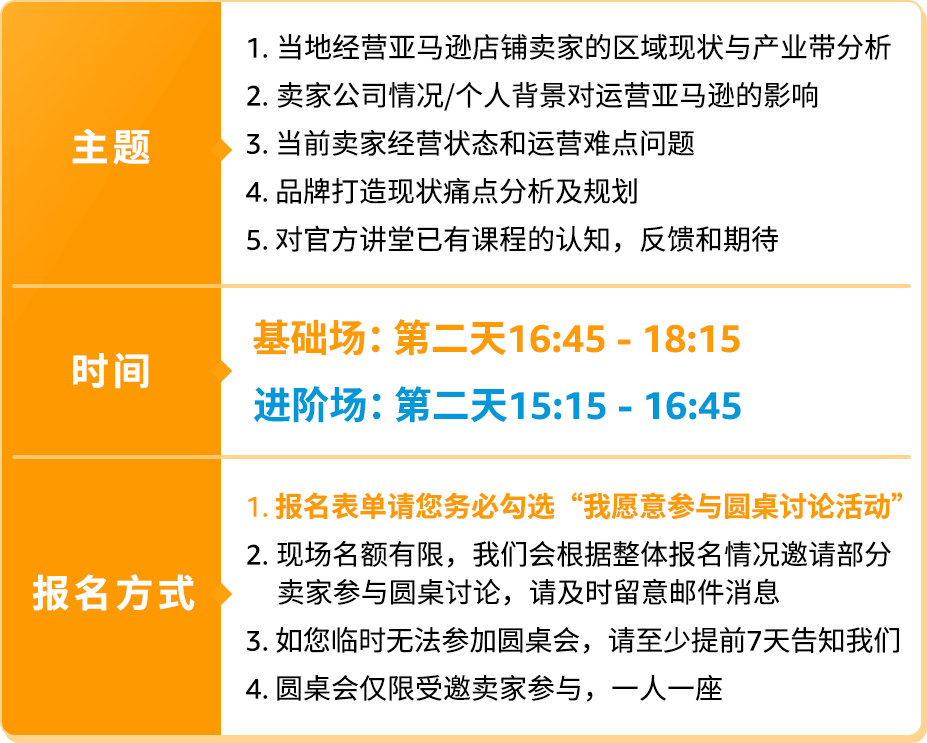 本次亚马逊官方讲堂特训营专门开设圆桌交流会限量名额!受邀卖家将有机会参与店铺运营全方位诊断,与亚马逊官方讲堂内容开发团队面对面交流答疑,并与其他精英卖家分享经验、共同成长!