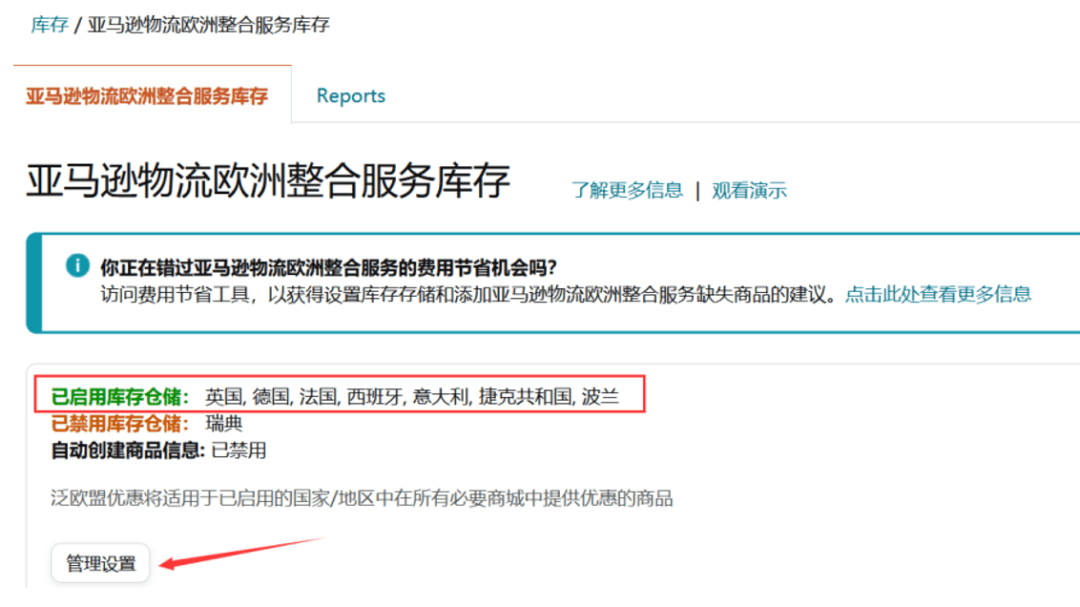 ✔️ 路径:库存>亚马逊物流欧洲整合服务库存>管理设置(如第一次登陆该界面请点击橙色“开始”按钮)