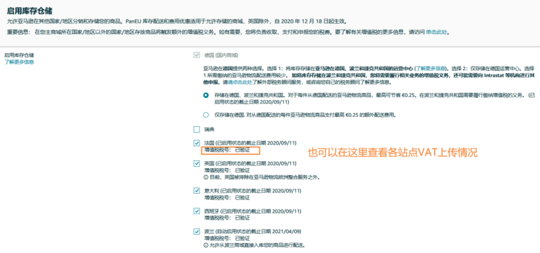 ✔️ 仓储及增值税要求:在两个及以上欧洲站点启用库存仓储并至少2个增值税税号(卖家已经注册增值税号的站点会自动启用库存仓储)。