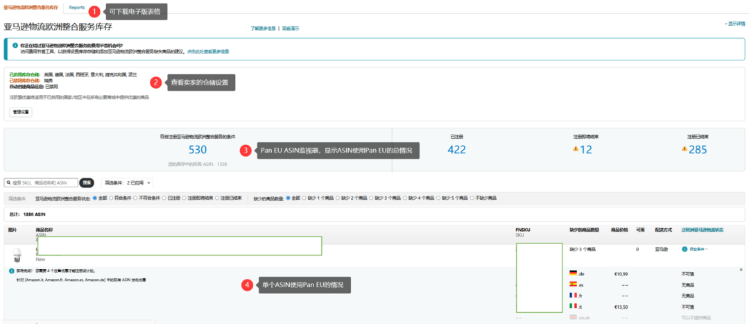 ③ 监视器显示卖家使用亚马逊物流欧洲整合服务的ASIN总体情况;