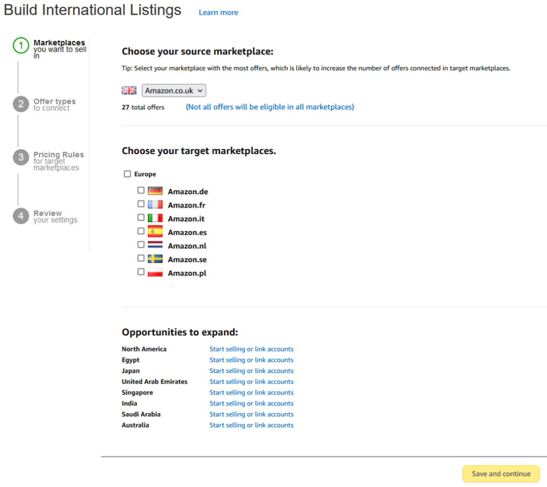 Step3:从列表中选择您的目标商城,您可以选择要扩展业务的地点,或者如果您想全部展开,请单击“欧洲”;