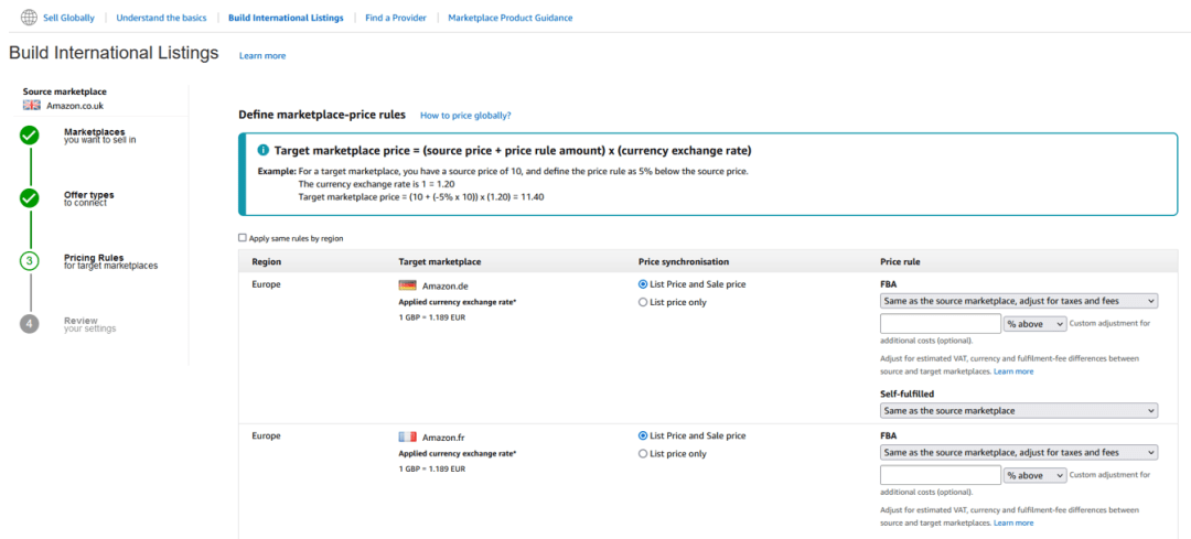Step5:定义您要在目标商城中使用的定价规则。在每个目标商城中,您可定义特定的规则,也可单击“按区域应用相同的规则”(如果适用)。您可设置“与来源商城相同,根据税费和其他费用进行调整”,也可设置任何自定义定价规则,非常灵活。