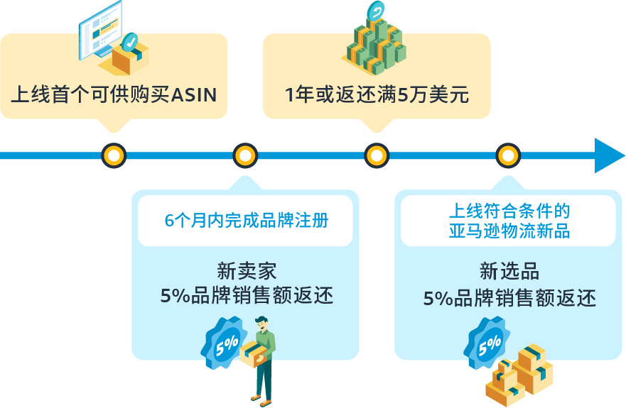 5万美元的返还并不是终点!新卖家朋友们除了享受新卖家入门大礼包中的5%品牌销售额返现外,在此后的销售中还可以选择加入亚马逊物流新品入仓优惠计划,继续享受无限量新选品5%品牌销售额返还!