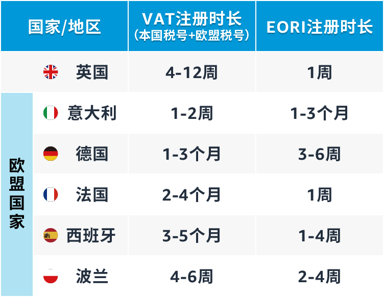 您可参考下图,获取欧洲各国VAT及EORI注册申请时长。