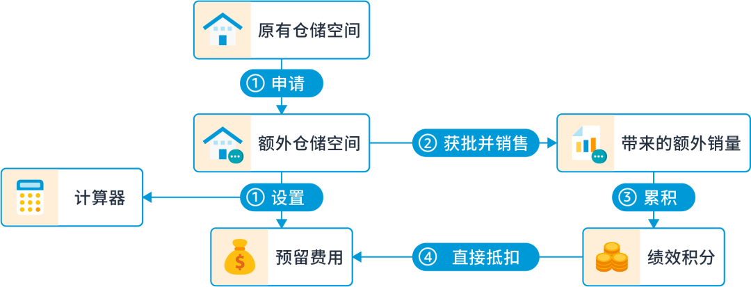 对于卖家利用这些增加的空间所带来的销量、所销售的每一美元都可获得相应的绩效积分,用于抵扣预留费用。
