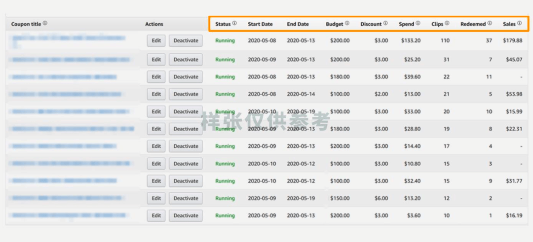 您可以登录亚马逊卖家平台,点击“广告” > “优惠券”,查看所有曾创建的优惠券信息,包括优惠券的开始和结束时间、预算设置及花费、折扣、买家领取及兑换数量,以及每个优惠券设置所带来的销售额。