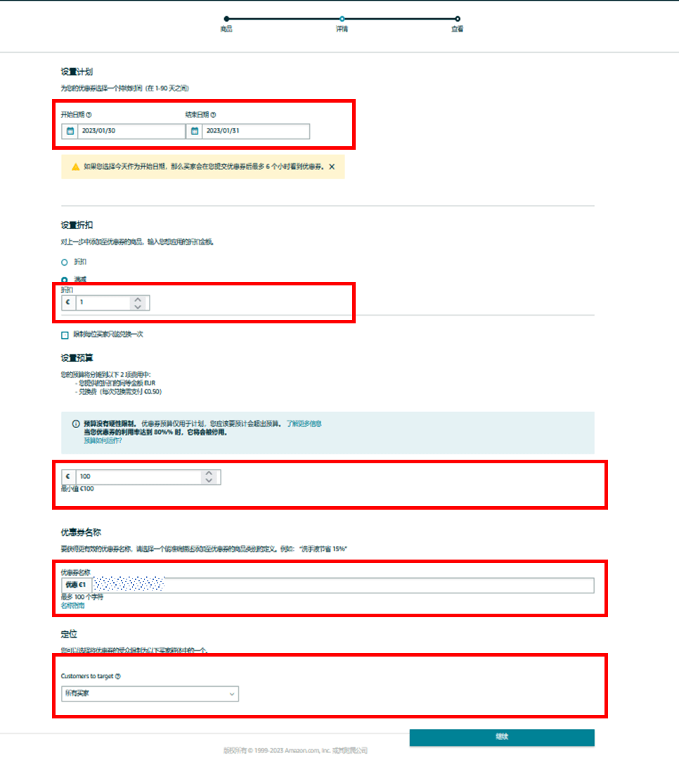 根据页面提示填写(日期、折扣、预算、活动名称、客户群体等)后,点击“继续”;