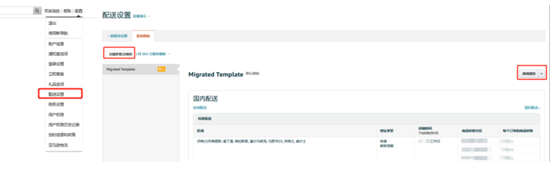 ◆【卖家平台】-【设置】-【配送设置】-点击【创建新配送模板】